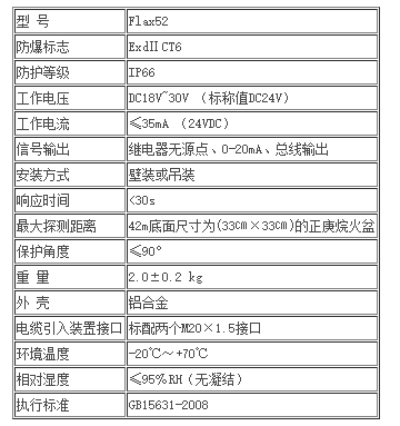 二.Flax52點型紅外火焰探測器技術參數